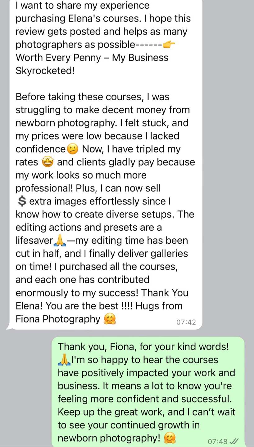 I decided to create Elena Dumitrescu Academy because photographers from around the world wished to learn the art of newborn and maternity photography from me. Their passion, their curiosity, and their trust became the inspiration behind this academy—a place where knowledge flows, creativity thrives, and the delicate beauty of new life is forever preserved through art.